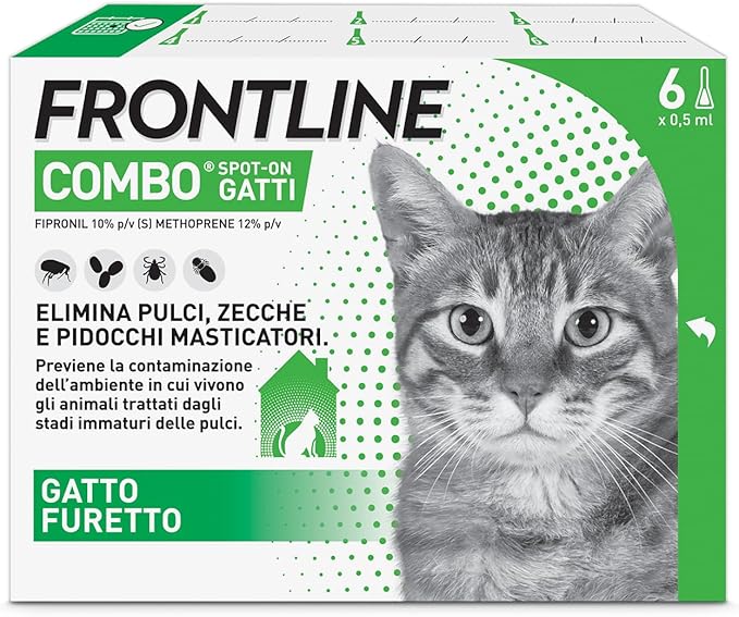 FRONTLINE Combo è un trattamento antiparassitario spot-on progettato per proteggere gatti, gattini e furetti da pulci, zecche e pidocchi. Grazie alla combinazione dei principi attivi Fipronil e (S)-methoprene, il prodotto agisce non solo sui parassiti adulti ma anche sulle uova…